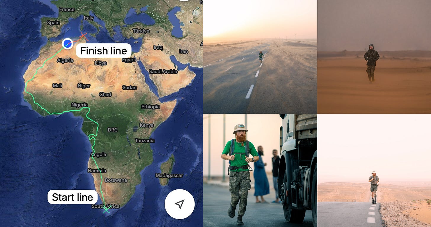 2. Russ Cook. Attempting to become the first person to run the length of Africa. That’s over 360 marathons. He started in April 2023. So far he’s run 15,683km and has just 9 days left until he completes his mission. Have been following him all the way. An amazing human being. Latest update video below. And link here to his fundraiser.